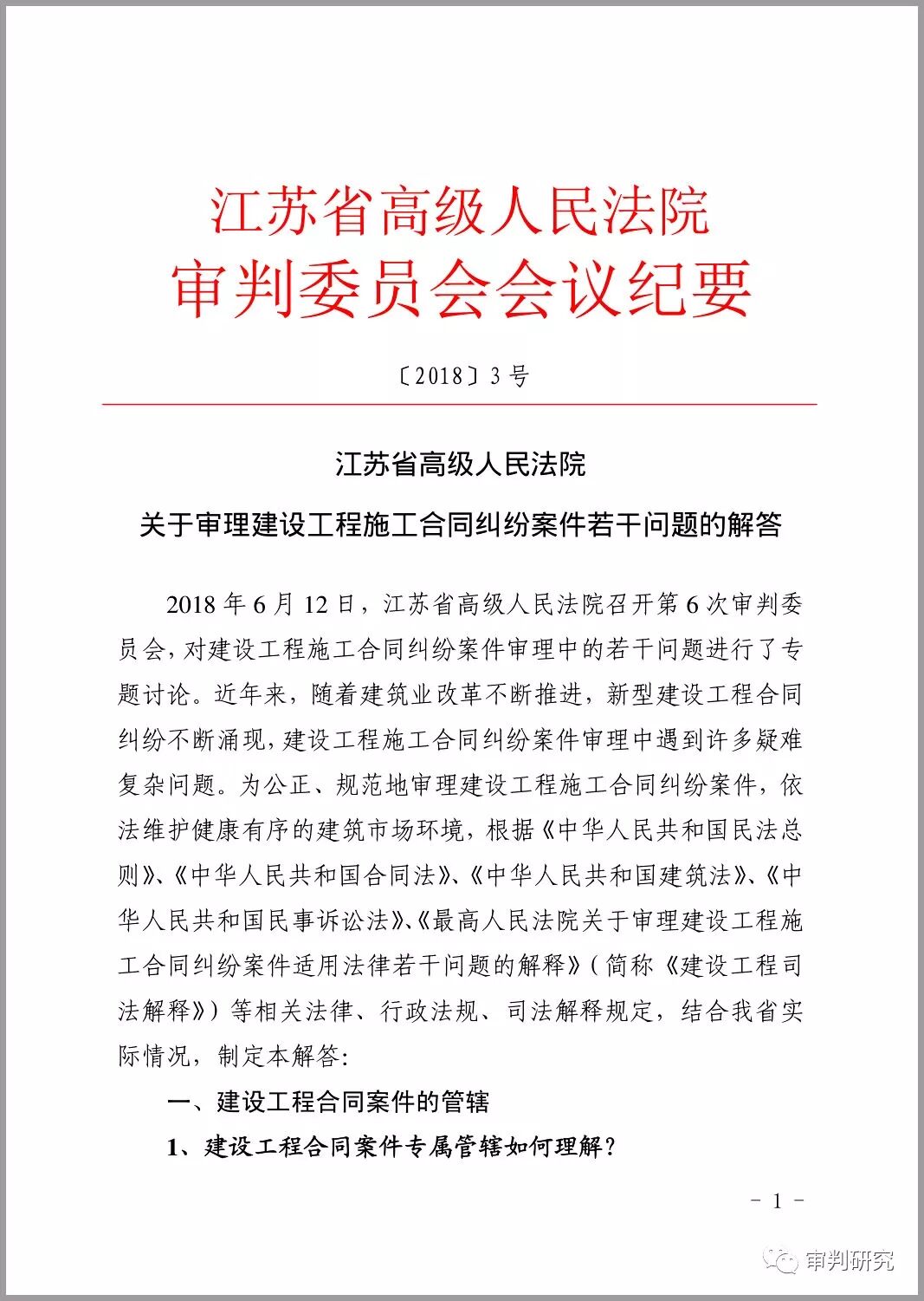 2018年6月12日,江苏省高级人民法院召开第6次审判委员会,对建设工程施工合同纠纷案件审理中的若干问题进行了专题讨论。近年来,随着建筑业改革不断推进,新型建设工程合同纠纷不断涌现,建设工程施工合同纠纷案件审理中遇到许多疑难复杂问题。为公正、规范地审理建设工程施工合同纠纷案件,依法维护健康有序的建筑市场环境,根据《中华人民共和国民法总则》、《中华人民共和国合同法》、《中华人民共和国建筑法》、《中华人民共和国民事诉讼法》、《最高人民法院关于审理建设工程施工合同纠纷案件适用法律若干问题的解释》(简称《建设工程司法解释》)等相关法律、行政法规、司法解释规定,结合我省实际情况,制定本解答: