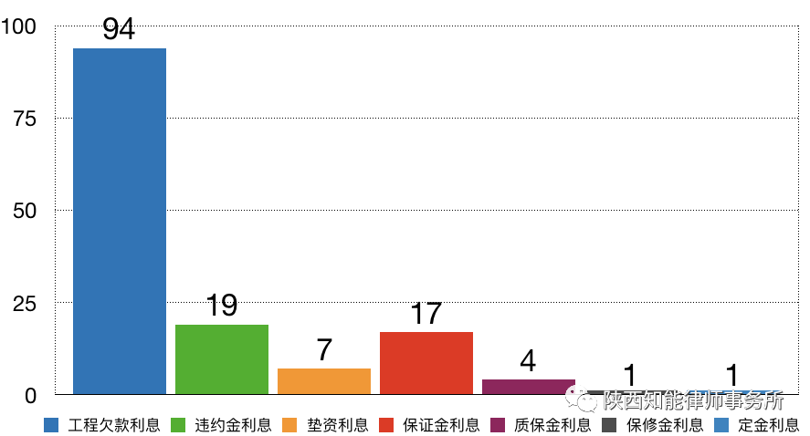 根据统计数据,当事人对于建设工程利息部分的主张,主要有7大类。主张工程欠款利息的有94件,主张违约金利息的有19件,主张垫资利息的有7件,主张保证金利息的有17件,主张质保金利息的有4件,主张保修金利息的有1件,主张定金利息的有1件。可以得出,当事人对于利息部分的主张大部分是基于工程欠款没有按时给付产生的利息。