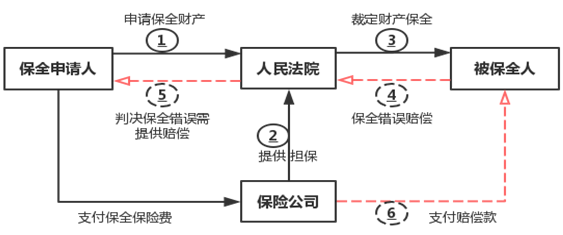 保全申请人与保险人签署保险合同,并支付保全保险费用购买保险人的保险产品(详情如下图黑色实线部分的内容)。若保全申请人出现保全错误的情形,被保全人可以此向法院提起保全错误损害赔偿诉讼,请求法院判决保全申请人就错误保全行为所造成的损害承担赔偿责任。同时,保险人因与保全申请人事前签署的保险合同而出具承诺愿意承担保全错误损害赔偿的保函,被保全人的因保全申请人的错误的保全行为所造成的损失由保险人承担(详情如下图红色虚线部分的内容)。